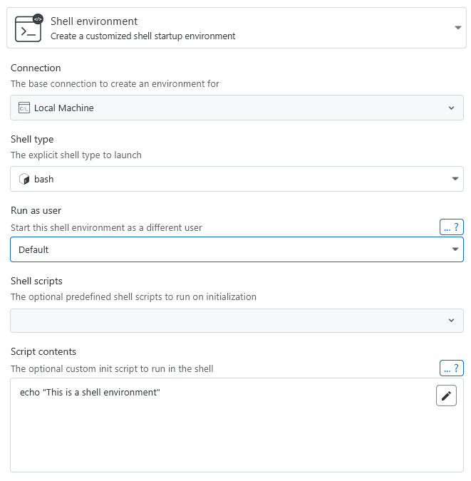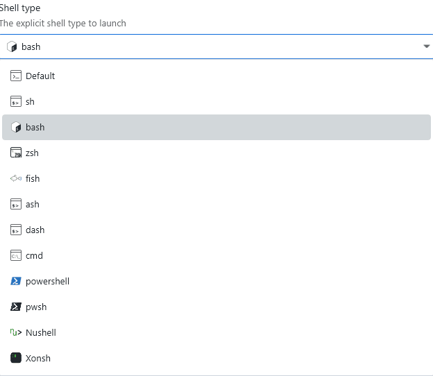 If you don't want to assign an explicit shell type, you can choose to keep the default of the target system. This will then essentially use your currently configured login shell on a system. This is useful if you don't care about the exact shell and only want to change the user of the shell environment, e.g., elevating to root in your current shell.