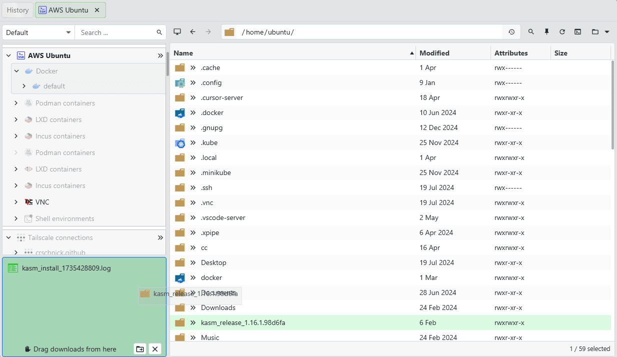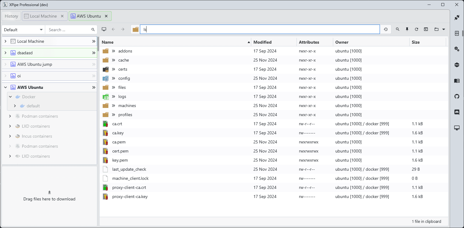 Pressing Control+V in any remote file browser session will paste these files into the remote directory. In the same manner, you can press Control+C with a selection of remote files to put them into the XPipe clipboard. Pasting these files on another tab will then transfer these remote files to that system. If the copy-paste operation is done on the same system, the files are copied using a native copy command like cp.
