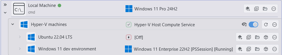 For Windows VMs, Hyper-V supports a special connection method using PsSession, which XPipe will use by default and won't require any SSH server. Since SSH is still the preferred connection method, you can also look into setting up an SSH server on your Windows VM. XPipe will automatically prefer an SSH connection if available but fall back to PsSession if not. It will display the current status of which connection method it uses for each VM: