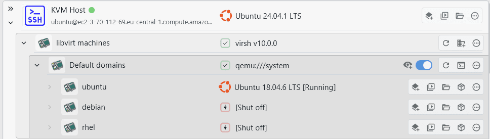 XPipe supports connecting to and managing your KVM VMs, also called domains, on any system. For that it uses the virsh command-line tool of libvirt. Adding the KVM host system as a connection to XPipe, usually via SSH, and then searching for available connections on the added system will make the libvirt integration show up.