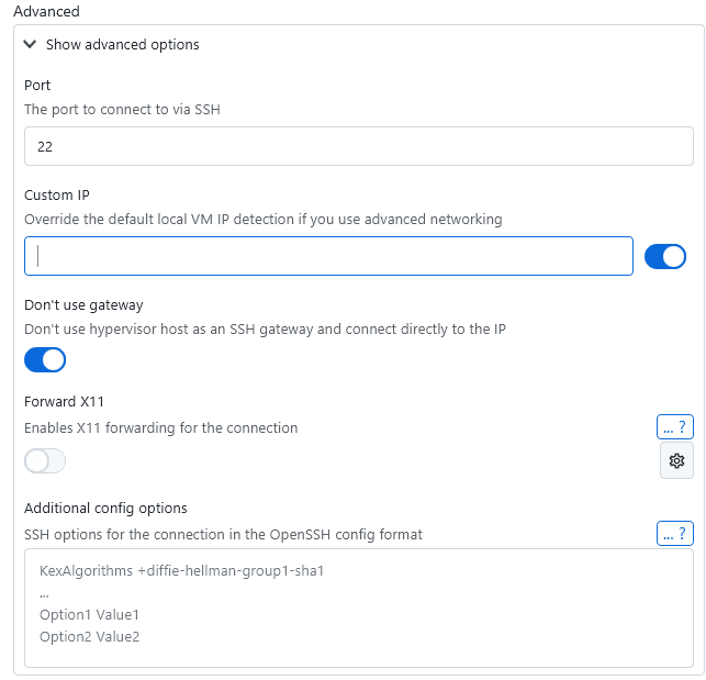 Furthermore, by default, XPipe always uses the hypervisor host system as an SSH gateway to connect to a guest. This is done because XPipe can't be sure whether your VM is reachable from outside the host system or not. This approach, however, breaks in cases where the networking is locked down and a guest VM is only reachable from the outside and not from the hypervisor host system itself. In this case, you can toggle the option Don't use gateway to connect directly to the VM IP address instead.