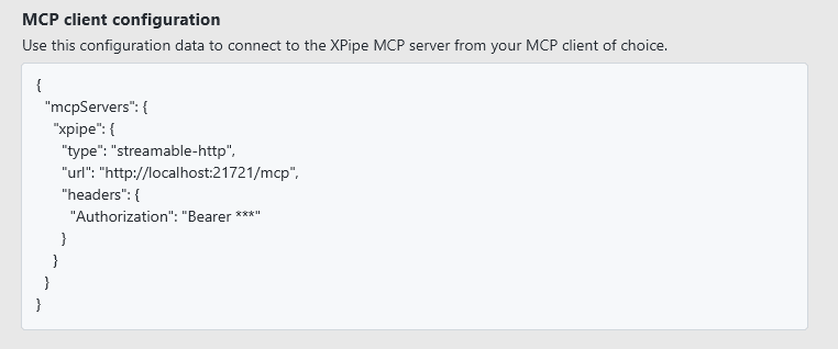Note that the streamable HTTP transport protocol is required. This is relatively new and might not be supported by all clients yet. If your MCP client only supports the SSE transport, then you won't be able to connect to the XPipe MCP server. If you can only enter the URL and do not have an option to choose between different protocols, it is likely that only SSE is supported. XPipe will show an error message if a client attempts to connect via SSE.