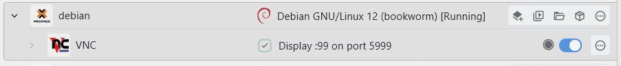 Proxmox offers the option to access VM displays via an external VNC client in addition to the built-in noVNC web-based interface in the Proxmox dashboard. XPipe can use this functionality automatically via the Enable VNC access action in the connection context menu: