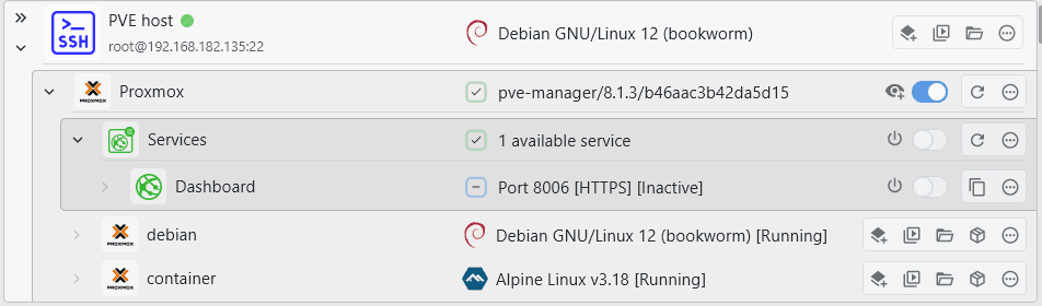 You also have access to the Proxmox dashboard via the built-in service that is automatically added for a Proxmox system. This is a normal service tunnel that comes with all the usual features of services in XPipe. This service tunnel is established to your Proxmox host system and allows you to access the dashboard without needing to expose it to the public.