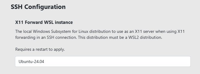 XPipe allows you to use the WSL2 X11 capabilities for your SSH connection. The only thing you need for this is a WSL2 distribution installed on your local system. XPipe will automatically choose a compatible installed distribution if possible, but you can also use another one in the settings menu: