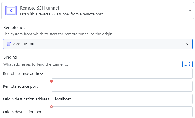 The binding information you provide is passed straight to the ssh client as follows: -R [remote_source_address:]remote_source_port:origin_destination_address:origin_destination_port. By default, the remote source address will bind to the loopback interface. You can also make use of any address wildcards, e.g. setting the address to 0.0.0.0 in order to bind to all network interfaces accessible via IPv4. When you completely omit the address, the wildcard *, which allows connections on all network interfaces, will be used. Note that some network interfaces notation might not be supported on all operating systems. Windows servers for example don't support the wildcard *.