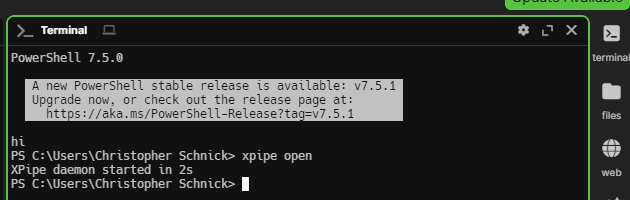 Terminal prompt tools allow you to fully customize the prompts in your shell with additional information. XPipe supports the popular terminal prompts Starship, Oh My Posh, and Oh My Zsh. Here is how Starship looks like with the default configuration:
