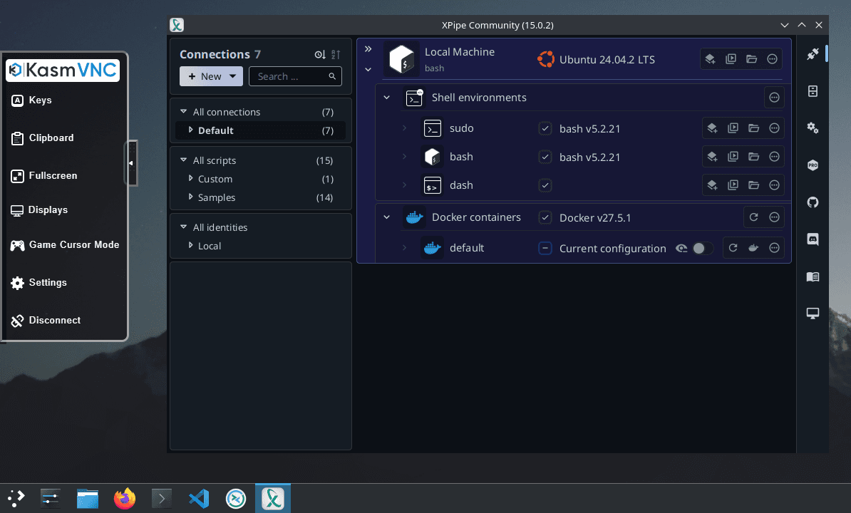 Since it makes sense to access your XPipe environment from the web, there is the so-called XPipe Webtop docker container image available. XPipe Webtop is a web-based desktop environment that can be run in a container and accessed from a browser via KasmVNC. The desktop environment comes with XPipe and various terminals, editors, and more tools preinstalled and configured.