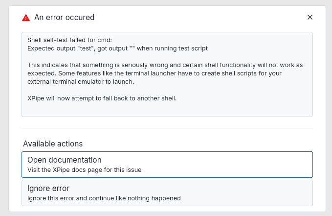 In other cases, your local shell might start up but does not work properly. XPipe runs a quick test to see whether basic features such as creating shell scripts and running them results in the expected output. If it doesn't, you will receive an error message like this: